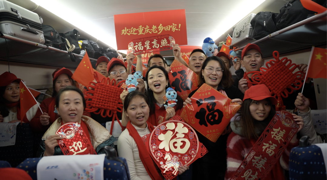 这趟从广州南驶向重庆西的 G3724 次列车,满载着约 500 名重庆老乡的思念与牵挂。8 点 30 分,列车准点驶出站台,鲜红的窗花、喜庆的中国结将车厢装点得年味十足。