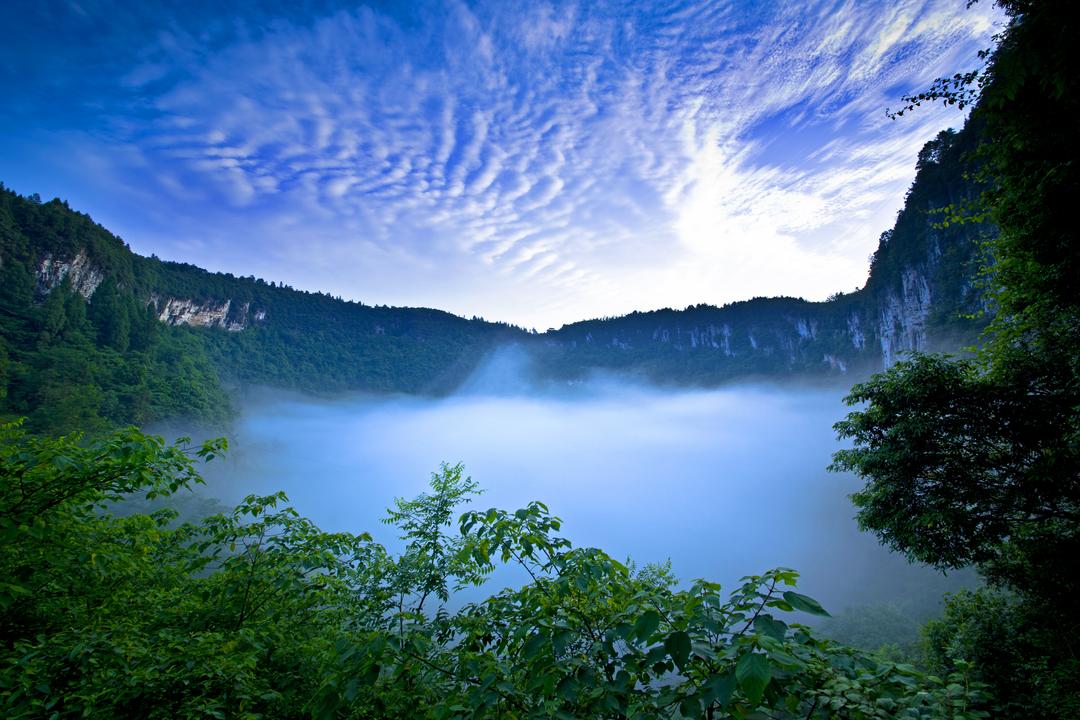 夏季(6-8月):最凉爽的避暑拍摄地,坑内气温比外界低3-5℃,远离酷暑难耐。此时坑外植被繁茂、绿意浓郁,5-9月雨季期间,天坑常被云雾缭绕,宛如仙境,轻松拍出梦幻缥缈的大片。