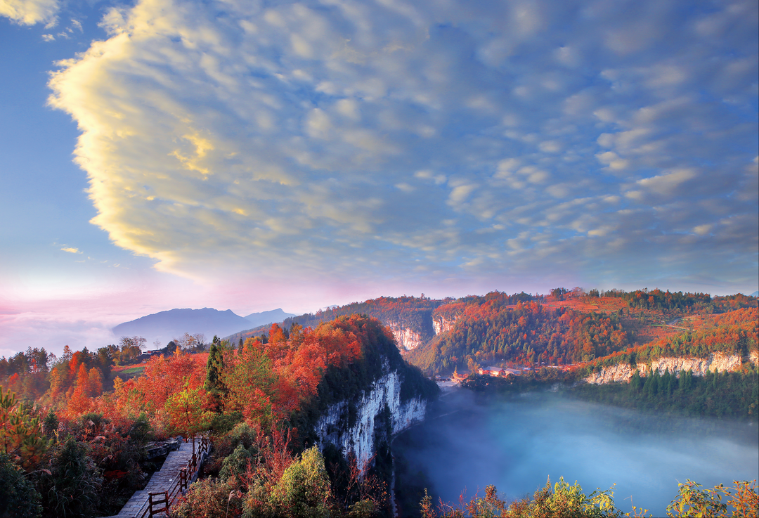 秋季(9-11月):最绚烂的时节,气温15-28℃。天坑周边山林换上五彩盛装,金黄、橙红等色彩与喀斯特地貌碰撞,层次分明、色彩绚丽,是捕捉斑斓秋景的绝佳时机。