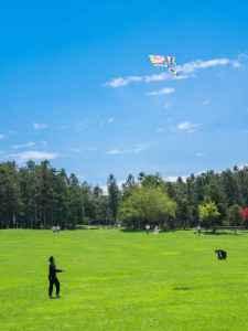 彩色的球体在蓝天绿草间格外醒目。