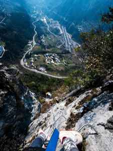 像一条细线挂在近乎垂直的崖壁上,