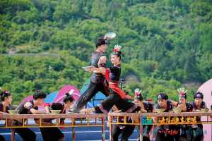 在文艺演出中,互动民俗表演《新土家·趣乡村》巧妙融合土家玩牛、高杆高台舞狮、土家丢马锣三大非遗,展现武陵山区淳朴热烈的乡土风情,尽显土家人乐观爽朗的精气神;舞蹈《喝起 走起 摔起》以土家族摔碗酒为灵感,刚劲有力的舞姿再现举杯畅饮、摔碗助兴的热闹场景,既展现土家儿女的豪迈热忱,也跳出新时代老百姓幸福红火的生活图景。