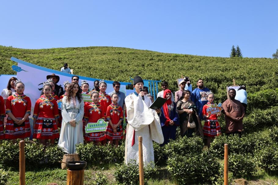 “今逢谷雨吉时,聚首金佛山下,谨以清茶之礼,敬天地,拜茶祖,谢茶农……”随着主礼人诵读祈福语,中外青少年代表手持清茶一同共饮,满满仪式感,尽显对茶俗文化的敬重。