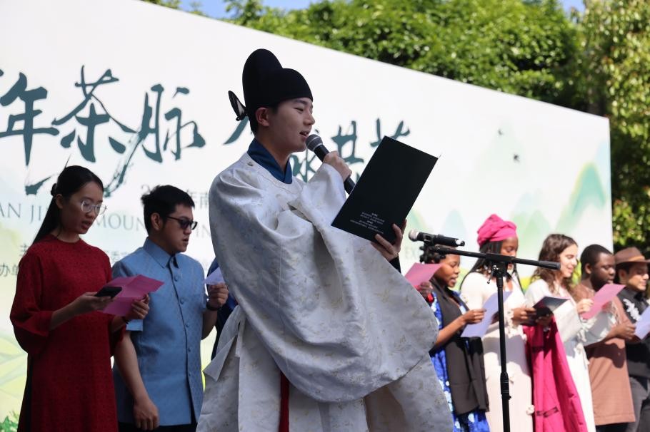 “常闻玉泉山,山洞多乳窟。仙鼠如白鸦,倒悬清溪月……”活动开场,一首由重庆交通大学留学生带来的《答族侄僧中孚赠玉泉仙人掌茶》诗朗诵,将在场众人带入千年茶韵之中。