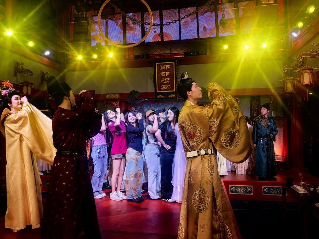 午餐时分,一场别开生面的“丰都福宴”将气氛推向顶点。餐饮与鬼城文化、娱乐表演巧妙融合,留学生们不断发出“哇塞”的惊叹,甚至忍不住跑上舞台与演员互动。来自马来西亚的宋以轩同学激动地说:“东南亚的文化,尤其是宗教、生死观念,跟中国有很多相似之处。鬼城其实不可怕,景区里、表演中的很多内容我们都能产生共鸣,非常值得推荐家人和朋友来丰都!”