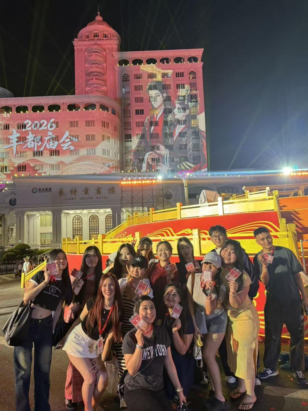 2026年4月18日晚,丰都县城华灯璀璨,第十一届重庆文化旅游惠民消费季(春夏)暨2026丰都庙会进入高潮。在热闹的街头巡游队伍中,一群特殊的“海外推荐官”格外引人注目——来自西南大学的13名留学生,应西部国际传播中心“海外推荐官”项目之邀,专程来到丰都,共同见证这场以“逛丰都庙会·结三生情缘”为主题的文化盛宴。