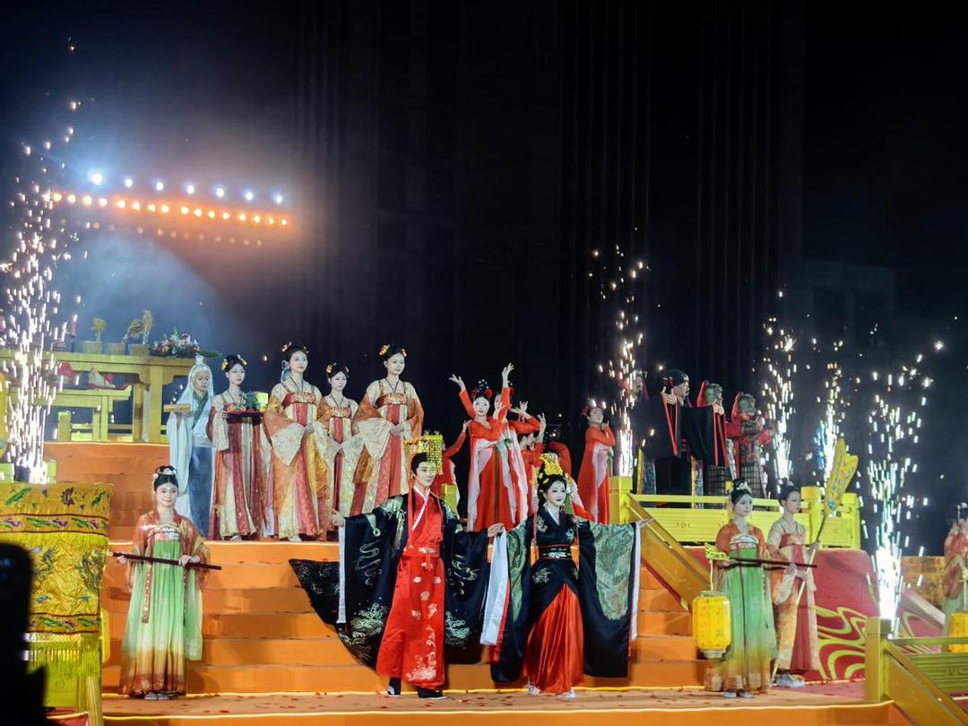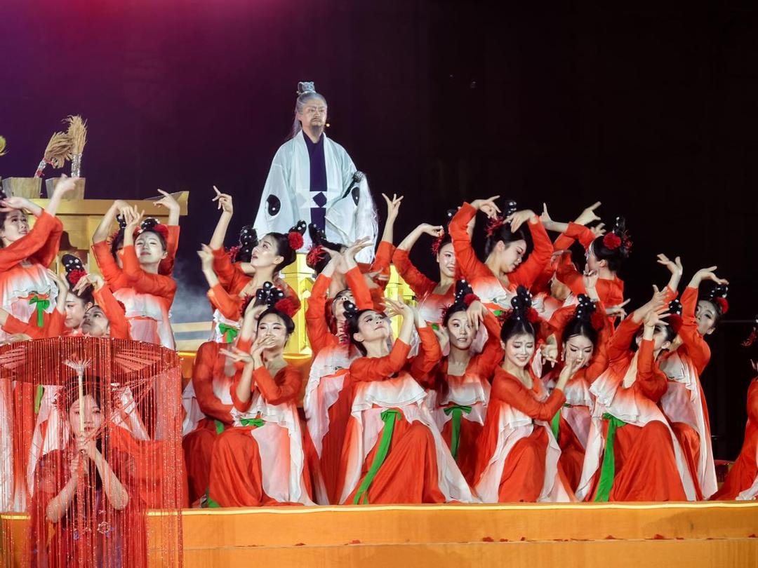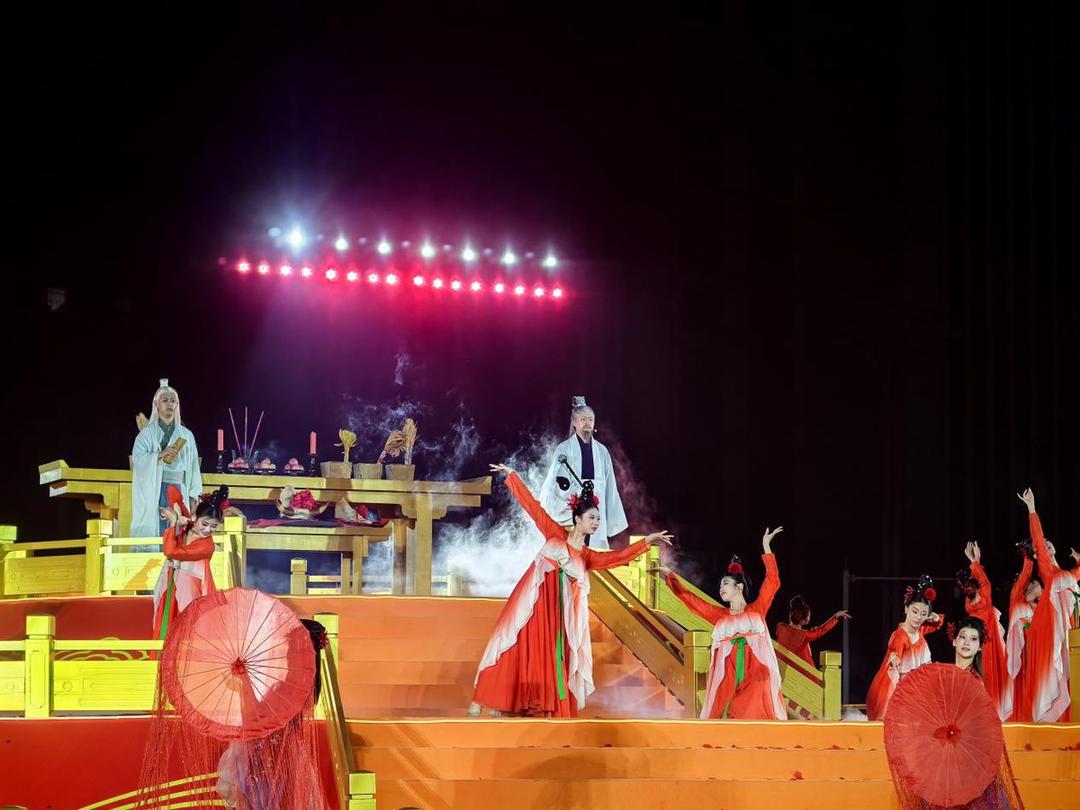 当晚19时48分,庄重的祈福仪式率先举行。在三层圆形祈福台上,依古制陈列香案贡品,旗幡飘扬。在神鼓与颂歌中,阴天子与天子娘娘登坛主祭,敬献五谷三牲,祈愿风调雨顺、国泰民安。巴人莽号、神鼓舞等古老仪礼与现代表演形式结合,传递出深厚的历史文化底蕴。