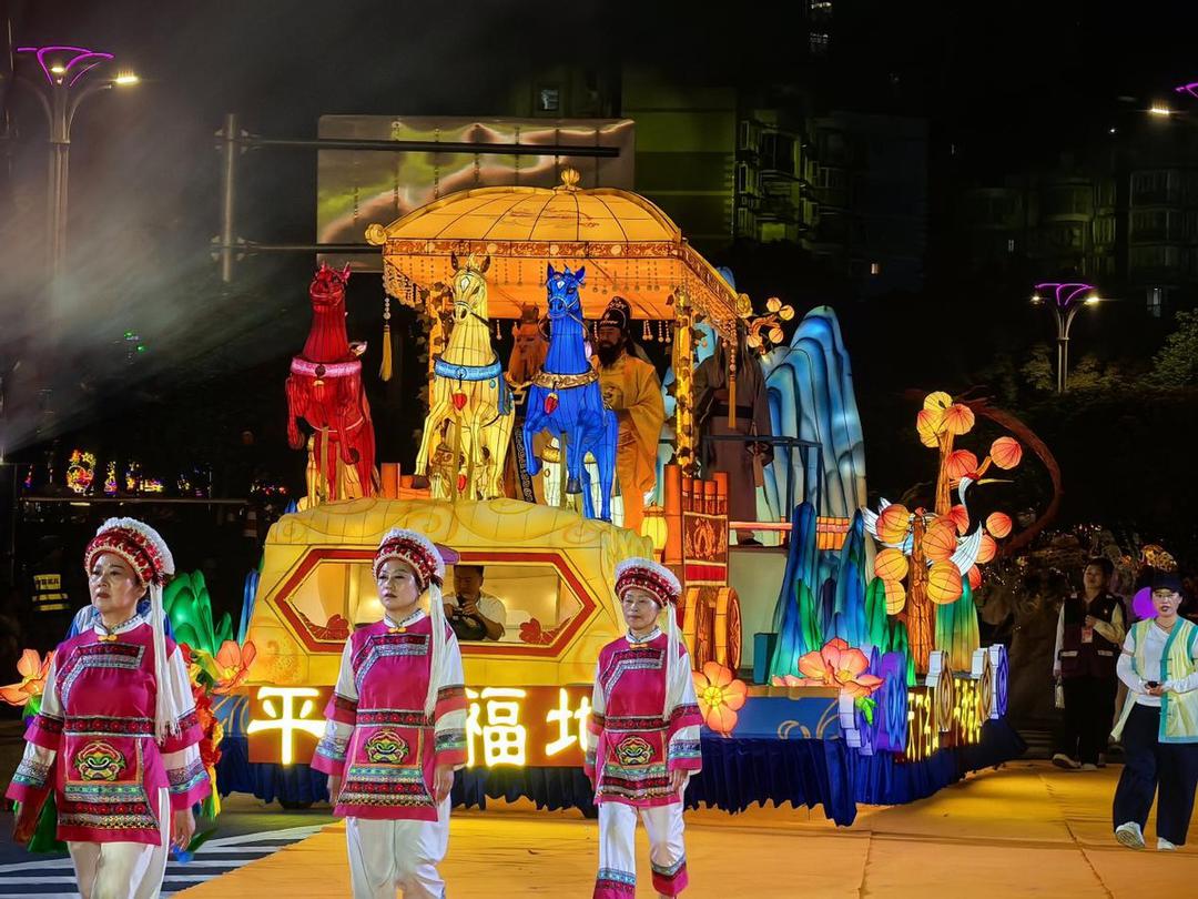 祈福礼成,巡游队伍浩荡出发。五台主题花车——“三生情缘”“巴国传说”“酆都神话”“平都福地”“南天仙境”流光溢彩,依次驶过核心街区。巴国神鼓、钟馗小鬼、彩带龙、高跷、十直狮子、变脸吐火等非遗绝活接连上演。在四大银行路口等驻停表演点,金色凤凰、蝴蝶仙子、鱼灯与国风伞舞交织,喷火、舞龙互动热烈。终点处,热气球升空、冷焰火绽放,150名舞者带来潮流快闪,观众与演员携手共舞,将气氛推向高潮。
