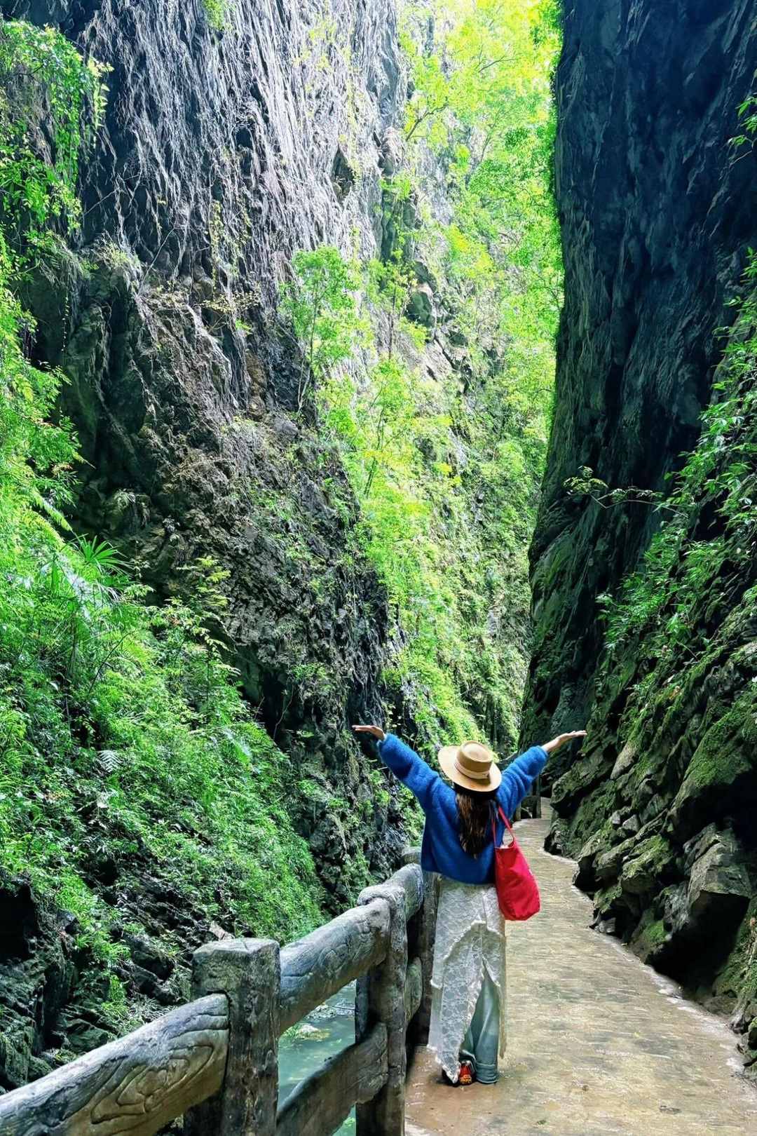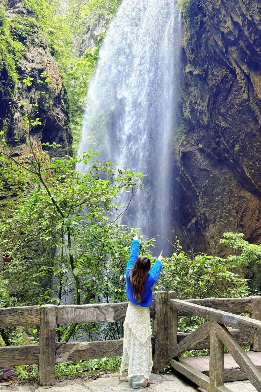 下午:转战龙水峡地缝。如果说天上是人间,这里就是地心。峡谷深不见底,两侧是刀削般的崖壁,飞瀑从头顶倾泻而下,水汽扑面而来。